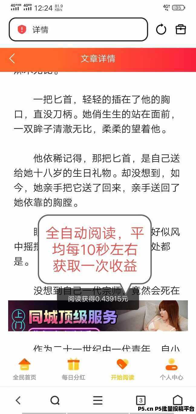 点击:开始阅读,双手离开手机,挂着不要动,自动褂机.赚米!